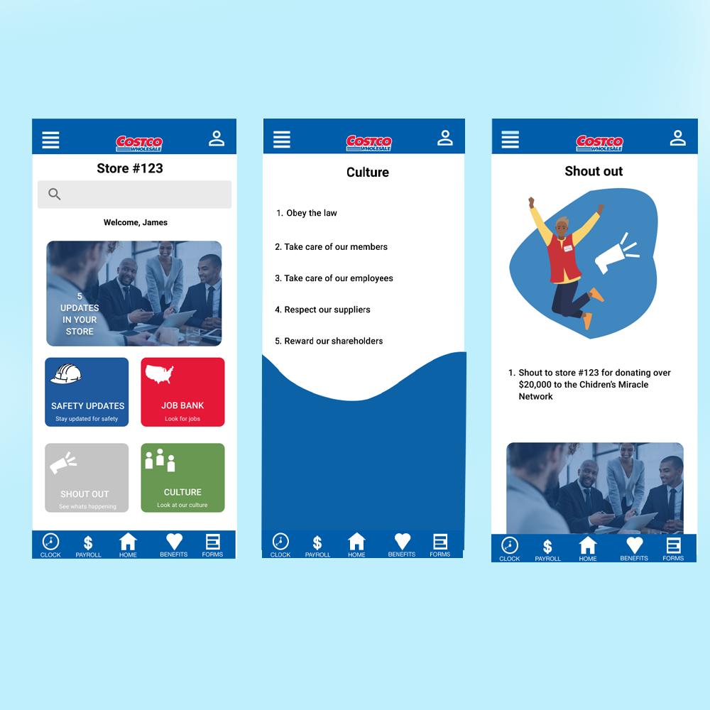Goal: Create a better user experience for Costco employees by creating a mobile app that is a one-stop shop for all of their needs.